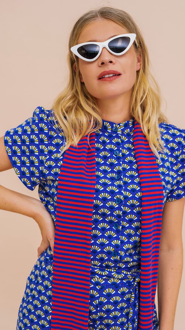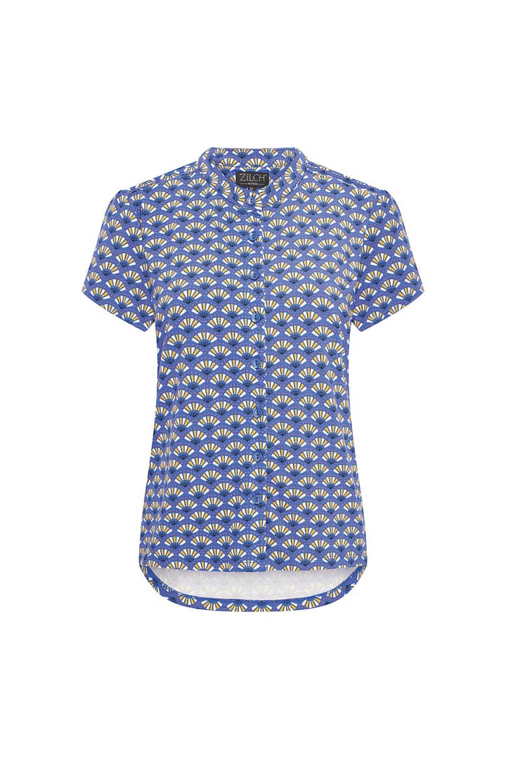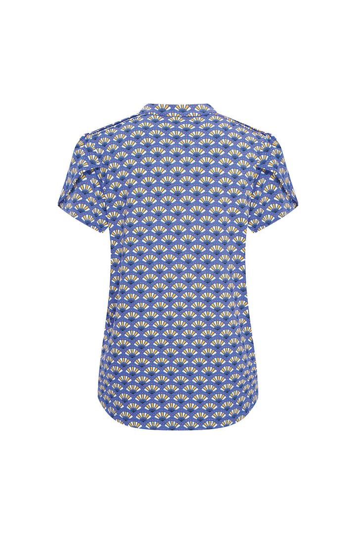 Soepele blouse met kleurrijke zomerse prints gemaakt van eco-vriendelijke viscose. Het blouseje heeft korte mouwen, een hoog gesloten ronde hals en sluit met knoopjes.