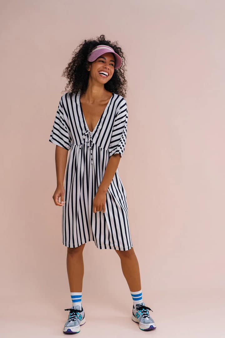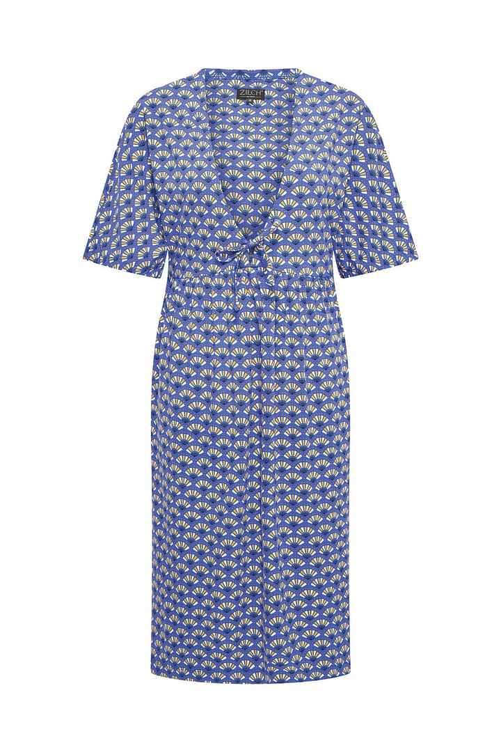 Deze los vallende jurk van zachte ecovero viscose valt tot boven de knie bij een lichaamslengte van 169 cm. Het jurkje heeft een diepe V-hals met een strikje, korte los vallende mouwen tot  de elleboog, verborgen zakken in de zijnaad